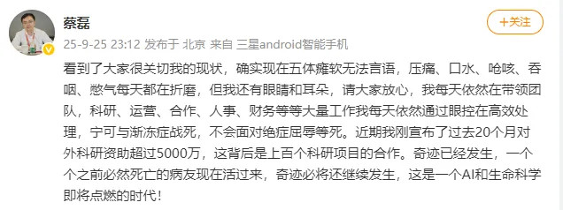 9月25日晚,蔡磊在社媒发文:看到了大家很关切我的现状,确实现在五体瘫软无法言语,压痛、口水、呛咳、吞咽、憋气每天都在折磨,但我还有眼睛和耳朵,请大家放心,我每天依然在带领团队,科研、运营、合作、人事、财务等等大量工作我每天依然通过眼控在高效处理。
