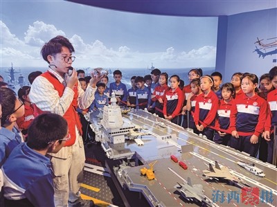 成长仪式落下帷幕,研学之旅精彩继续。孩子们兴致勃勃地走进福建舰模型展区,航母、舰艇模型在灯光下熠熠生辉。孩子们围在模型展柜前认真观察舰身构造,为中国海军的强大深感自豪。