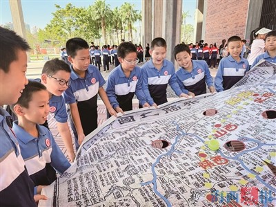 最欢乐的时刻来自“古今形胜之图大冒险”。孩子们围成一圈,共同托举一块印有古今地标图的大布,小球从起点滚向终点,需一路避开布面上“陷阱”般的小洞。在一次次尝试、一声声加油声中,合作与坚持的精神悄悄扎根在孩子们心中。当小球成功抵达终点,全场爆发热烈掌声,成就感瞬间绽放。